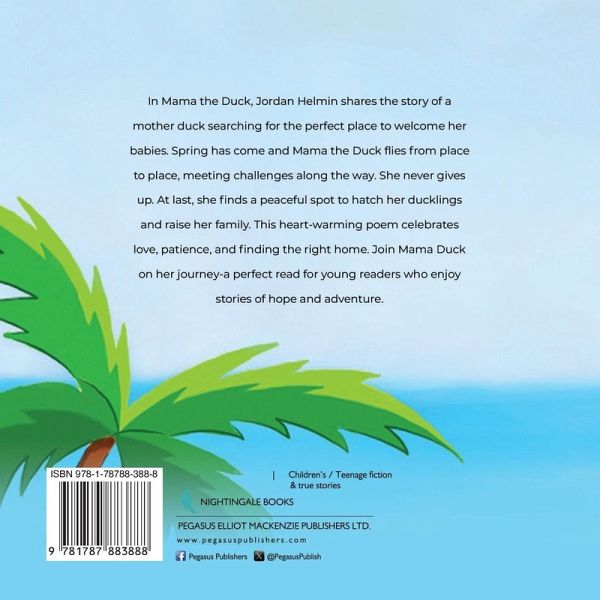 In Mama the Duck, Jordan Helmin shares the story of a mother duck searching for the perfect place to welcome her babies. Spring has come and Mama the Duck flies from place to place, meeting challenges along the way. She never gives up. At last, she finds a peaceful spot to hatch her ducklings and raise her family. This heart-warming poem celebrates love, patience, and finding the right home. Join Mama Duck on her journey-a perfect read for young readers who enjoy stories of hope and adventure.