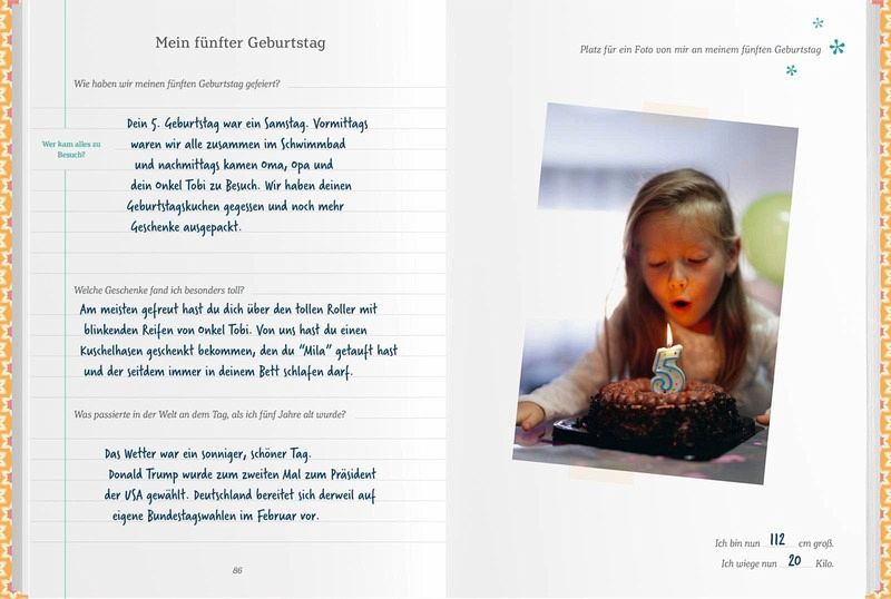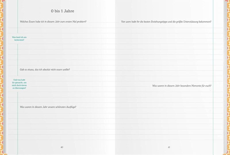 Das erste Lachen, der erste Schultag, gemeinsame Reisen und Ausflüge, die eigenen Wünsche für das Kind und vieles mehr - einfühlsame Fragen unterstützen beim Ausfüllen, lassen Mama und Papa zu Wort kommen und sorgen dafür, dass kein wichtiges Ereignis vergessen wird. So werden alle unvergesslichen und wesentlichen Momente auf ewig festgehalten.
