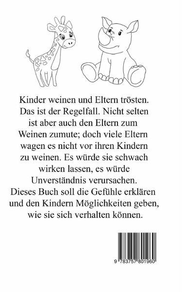 Kinder weinen und Eltern trösten. Das ist der Regelfall. Nicht selten ist aber auch den Eltern zum Weinen zumute; doch viele Eltern wagen es nicht vor ihren Kindern zu weinen. Es würde sie schwach wirken lassen, es würde Unverständnis verursachen. Dieses Buch soll die Gefühle erklären und den Kindern Möglichkeiten geben, wie sie sich verhalten können.
