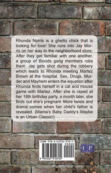 Rhonda Norris is a ghetto chick that is looking for love! She runs into Jay Morris on her way to the neighborhood store. After they get familiar with one another, a group of Bloods gang members robs them. Jay gets shot during the robbery which leads to Rhonda meeting Martez Brown at the hospital. Sex, Drugs, Murder and Mayhem enters the equation after Rhonda finds herself in a cat and mouse game with Martez. After she is raped at her 18th birthday party, a month later, she finds out she's pregnant. More twists and drama comes when her child's father is revealed. (Mama's Baby Daddy's Maybe is an Urban Classic!)