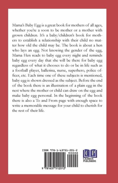 Mama's Baby Egg is a great book for mothers of all ages, whether you're a soon to be mother or a mother with grown children. It's a baby/children's book for mothers to establish a relationship with their child no matter how old the child may be. The book is about a hen who lays an egg. Not knowing the gender of the egg, Mama Hen reads to baby egg every night and reminds baby egg every day that she will be there for baby egg regardless of what it chooses to do or be in life such as a football player, ballerina, nurse, superhero, police officer, etc. Each time one of these subjects is mentioned, baby egg is shown dressed as the subject. Before the end of the book there is an illustration of a plain egg in the nest where the mother or child can draw on the egg and make baby egg personal. In the beginning of the book there is also a To and From page with enough space to write a memorable message for your child to cherish for the rest of their life.