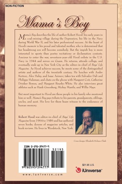 Mama's Boy describes the life of author Robert Hood: his early years in a coal-mining village during the Depression, his life in the navy during World War II, and his later professional success. At the heart of Hood's memoir is his proud and talented mother, who is determined that her headstrong son will become somebody. But the impish boy is more interested in sports than poetry recitations or declamation contests. Anxious to enter the war, seventeen-year-old Hood enlists in the U.S. Navy in 1944 and serves on Guam. He returns, attends college, and eventually ends up in New York City as the editor-in-chief of Boys' Life Magazine. As Hood achieves success, he meets some of the distinguished artists and authors of the twentieth century. He lunches with Andre Kertesz, Alex Haley, and Isaac Asimov; takes tea with Salvador Dali and Philippe Halsman; and chats on the phone with Margaret Coit, Catherine Drinker Bowen, and Margaret Bourke-White. He also interviews great athletes such as Hank Greenberg, Mickey Mantle, and Willie Mays. But most important to Hood are those people in his family who mentored him so well. Mama's Boy pays tribute to his parents, grandparents, siblings, uncles, and aunt. His love for them bears witness to the endurance of human memory.