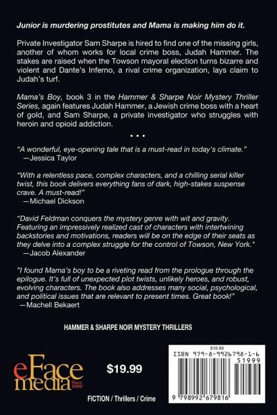 Junior is murdering prostitutes and Mama is making him do it. Private Investigator Sam Sharpe is hired to find one of the missing girls, another of whom works for local crime boss, Judah Hammer. The stakes are raised when the Towson mayoral election turns bizarre and violent and Dante's Inferno, a rival crime organization, lays claim to Judah's turf. Mama's Boy is book 3 in the Hammer & Sharpe Noir Mystery Thriller Series, all of which feature Judah Hammer, a Jewish crime boss with a heart of gold, and Sam Sharpe, a private investigator who struggles with heroin and opioid addiction.