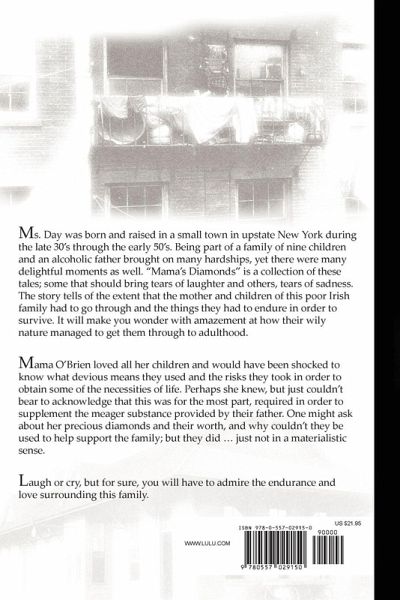 Ms. Day was born and raised in a small town in upstate New York during the late 30's through the early 50's. Being part of a family of nine children and an alcoholic father brought on many hardships, yet there were many delightful moments as well. "Mama's Diamonds" is a collection of these tales. The story tells of the extent that the mother and children of this poor Irish family had to go through and the things they had to endure in order to survive. Their wily nature helped. Mama O'Brien loved all her children and would have been shocked to know what devious means they used and the risks they took in order to obtain some of the necessities of life. Perhaps she knew, but just couldn't bear to acknowledge that this was for the most part, required in order to supplement the meager substance provided by their father. One might ask about her precious diamonds and their worth, and why couldn't they be used to help support the family; but they did ... just not in a materialistic sense.