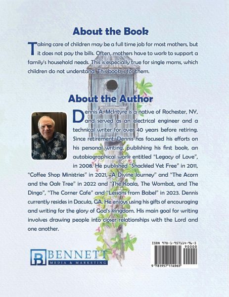 Dennis A. McIntyre is a native of Rochester, NY, and served as an electrical engineer and a technical writer for over 40 years before retiring. Since retirement, Dennis has focused his efforts on his personal writing, publishing his first book, an autobiographical work entitled "Legacy of Love", in 2008. He published "Shackled Yet Free" in 2011 and "Coffee Shop Ministries" in 2021. Dennis currently resides in Dacula, GA. He enjoys using his gifts of encouraging and writing for the glory of God's kingdom. His main goal for writing involves drawing people into closer relationships with the Lord and one another.