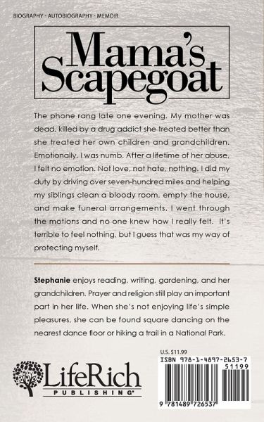 The phone rang late one evening. My mother was dead, killed by a drug addict she treated better than she treated her own children and grandchildren. Emotionally, I was numb. After a lifetime of her abuse, I felt no emotion. Not love, not hate, nothing. I did my duty by driving over seven-hundred miles and helping my siblings clean a bloody room, empty the house, and make funeral arrangements. I went through the motions and no one knew how I really felt. It's terrible to feel nothing, but I guess that was my way of protecting myself.