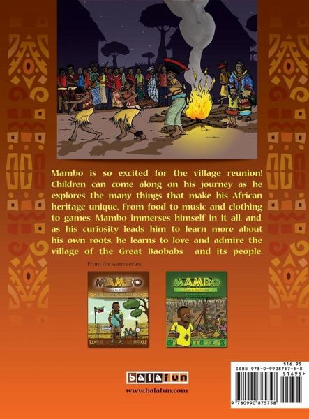 Mambo is so excited for the village reunion! Children can come along on his journey as he explores the many things that make his African heritage unique. From food to music and clothing to games, Mambo immerses himself in it all, and, as his curiosity leads him to learn more about his own roots, he learns to love and admire the village of the Great Baobabs and its people.