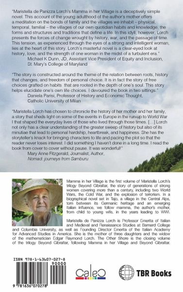 Mamma in her Village is the first volume of Maristella Lorch's trilogy Beyond Gibraltar, the story of generations of strong women covering more than a century, including two World Wars, the Cold War, and the explosion of terrorism. In a biographical novel set in Tajo, a village in the Central Alps, torn between its Germanic heritage and an emerging Italian influence, we follow mamma, the author's mother, from child to young wife, in the years leading to WWI.