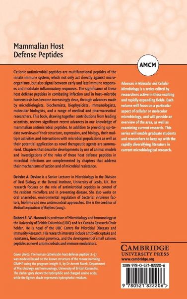 1. Overview: antimicrobial peptides, as seen from a rear-view mirror R. I. Lehrer; 2. Cationic antimicrobial peptides in regulation of commensal and pathogenic microbial populations D. A. Devine; 3. Multiple functions of antimicrobial peptides in host immunity D. Yang and J. J. Oppenheim; 4. Therapeutic potential and applications of innate immunity peptides T. J. Falla and L. Zhang; 5. Mammalian ߿Defensins in mucosal defence G. Diamond, D. Laube and M. Klein-Patel; 6. Biology and expression of the human cathelicidin LL-37 G. Gudmundsson and B. Agerberth; 7. Antimicrobial peptides of the alimentary tract of mammals C. Bevins and T. Ganz; 8. Antimicrobial peptides suppress microbial infections and sepsis in animal models K. A. Brogden, M. Ackermann, J. Zabner and M. J. Welsh; 9. Bacterial structure and physiology: influence on susceptibility to antimicrobial peptides R. E. W. Hancock; 9. The antifungal mechanisms of antimicrobial peptides E. J. Helmerhorst and F. G. Oppenheim; 10. Antimicrobial peptides from platelets in defence against cardiovascular infections M. R. Yeaman; 11. Mechanisms of bacterial resistance to antimicrobial peptides R. Tamayo, A. C. Portillo and J. S. Gunn; 12. Roles of antimicrobial peptides in pulmonary disease R. Bals.