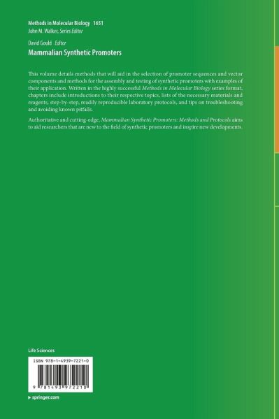 Initial Considerations before Designing a Promoter Construct.- Demonstrating Interactions of Transcription Factors with DNA by Electrophoretic Mobility Shift Assay.- Chromatin Immunoprecipitation and Quantitative Real-time PCR to Assess Binding of a Protein of Interest to Identified Predicted Binding Sites within a Promoter.- Secreted Reporters for Monitoring Multiple Promoter Function.- Bioluminescence Monitoring Of Promoter Activity In Vitro and In Vivo.- Monitoring Promoter Activity by Flow Cytometry.- Functional Screening of Core Promoter Activity.- Bioinformatically Informed Design of Synthetic Mammalian Promoters.- Synthetic Tumor Specific Promoters for Transcriptional Regulation of Viral Replication.- Constructing Strong Cell-Type-Specific Promoters through Informed Design.- PCR Assembly of Synthetic Promoters.- The Tetracycline Responsive System.- Light-responsive Promoters.- A Simple Method for Constructing Artificial Promoters Activated in Response to Ultrasound Stimulation.- Promoter Activation with Electromagnetism.- Application of Synthetic Tumor Specific Promoters Responsive to the Tumor Microenvironment.- A Modular Approach to Building Complex Synthetic Circuits.- Computational Sequence Design with R2oDNA Designer.- Design of Synthetic Promoters for Gene Circuits in Mammalian Cells.