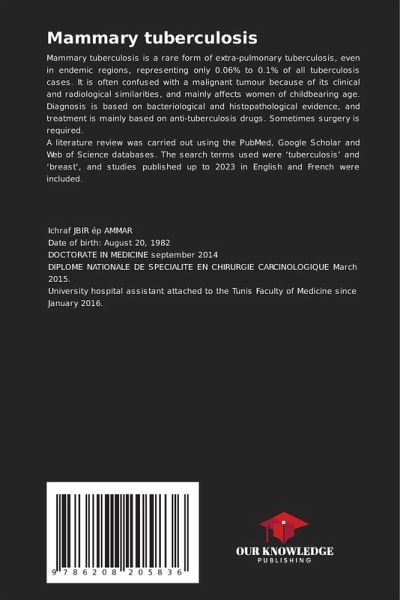 Mammary tuberculosis is a rare form of extra-pulmonary tuberculosis, even in endemic regions, representing only 0.06% to 0.1% of all tuberculosis cases. It is often confused with a malignant tumour because of its clinical and radiological similarities, and mainly affects women of childbearing age. Diagnosis is based on bacteriological and histopathological evidence, and treatment is mainly based on anti-tuberculosis drugs. Sometimes surgery is required.A literature review was carried out using the PubMed, Google Scholar and Web of Science databases. The search terms used were 'tuberculosis' and 'breast', and studies published up to 2023 in English and French were included.