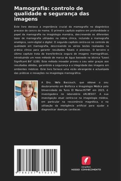 Este livro destaca a importância crucial da mamografia no diagnóstico precoce do cancro da mama. O primeiro capítulo explora em profundidade o papel da mamografia na imagiologia mamária, descrevendo os diferentes tipos de mamografia utilizados na rotina clínica, incluindo a mamografia analógica, semi-digital e digital. O segundo capítulo centra-se no controlo de qualidade em mamografia, descrevendo os vários testes realizados na prática clínica para garantir resultados fiáveis e precisos. O terceiro e último capítulo trata da transferência segura de imagens mamográficas, introduzindo um novo método de marca de água baseado na técnica "Least Significant Bit" (LSB). Este método inovador provou o seu valor graças aos resultados obtidos, garantindo a segurança e a integridade das imagens em ambientes médicos. Este livro fornece uma visão abrangente e actualizada das práticas e inovações na imagiologia mamográfica.