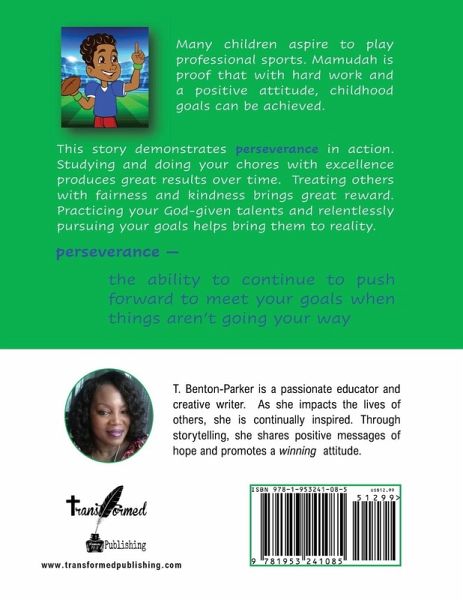 Many children aspire to play professional sports. Mamudah is proof that with hard work and a positive attitude, childhood goals can be achieved. This story demonstrates perseverance in action. Studying and doing your chores with excellence produces great results over time. Treating others with fairness and kindness brings great reward. Practicing your God-given talents and relentlessly pursuing your goals helps bring them to reality. perseverance - the ability to continue to push forward to meet your goals when things aren't going your way T. Benton-Parker is a passionate educator and creative writer. As she impacts the lives of others, she is continually inspired. Through storytelling, she shares positive messages of hope and promotes a winning attitude.