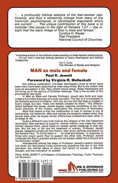 This is a print on demand book and is therefore non- returnable. Not without justification, Christian theologians (most of whom have been men) have been described as male chauvinists. But to the extent that such an accusation is fair, Paul Jewett would argue, these theologians are not living up to the genius of Christian theology. That is the burden of this provocative new book. In Man as Male and Female Professor Jewett sets forth and elaborates a full-orbed theology of human sexuality. The key to it is embedded in the Genesis account of creation. Not only are we told that Man is created in God's image but also "male and female created he them." The differentiation between the sexes, Jewett argues, captures something of the trinitarian character of the Creator, particularly the dimension of fellowship. What that means is that the relationship of man to woman is one of partnership, not hierarchy. Man and woman are properly related when they accept each other as equals whose differences complement each other in all areas of life. Quite a different view took hold as the religion of the Old Testament developed. Man was seen as superior, women inferior; man made the rules, woman obeyed them. Jesus made no radical verbal challenge to that system. But his way of life and his treatment of women, Professor Jewett argues, bespoke a profound new theory, later given definite expression by the Apostle Paul: "In Christ there is . . . no male and female." In response to those who would quote Paul to support the other side, Professor Jewett contends that Paul's practice simply did not always match his profound and revolutionary insight. Interspersed among the steps of Professor Jewett's careful theological study are fascinating notes concerning questions like sex in the final eschaton, the marital status of Jesus, the hatred of women in Western thought, and the ordination of women.