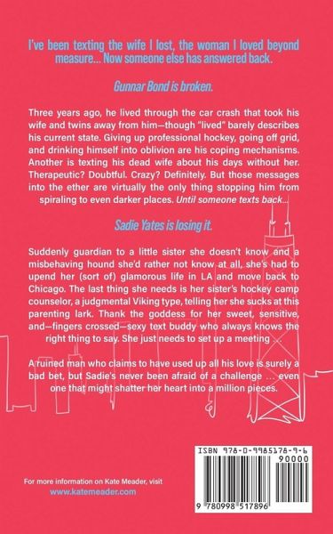 Gunnar Bond is broken. Three years ago, he lived through the car crash that took his wife and twins away from him-though "lived" barely describes his current state. Giving up professional hockey, going off grid, and drinking himself into oblivion are his coping mechanisms. Another is texting his dead wife about his days without her. Therapeutic? Doubtful. Crazy? Definitely. But those messages into the ether are virtually the only thing stopping him from spiraling to even darker places. Until someone texts back . . . Sadie Yates is losing it. Suddenly guardian to a little sister she doesn't know and a misbehaving hound she'd rather not know at all, she's had to upend her (sort of) glamorous life in LA and move back to Chicago. The nanny has quit, the money's running out, and her job is on the line. The last thing she needs is her sister's hockey camp counselor, a judgmental Viking type, telling her she sucks at this parenting lark. Thank the goddess for her sweet, sensitive, and-fingers crossed-sexy text buddy who always knows the right thing to say. In the same city at last, they can finally see if their online chemistry is mirrored in real life. She just needs to set up a meeting ... A ruined man who claims to have used up all his love is surely a bad bet, but Sadie's never been afraid of a challenge ... even one that might shatter her heart into a million pieces.