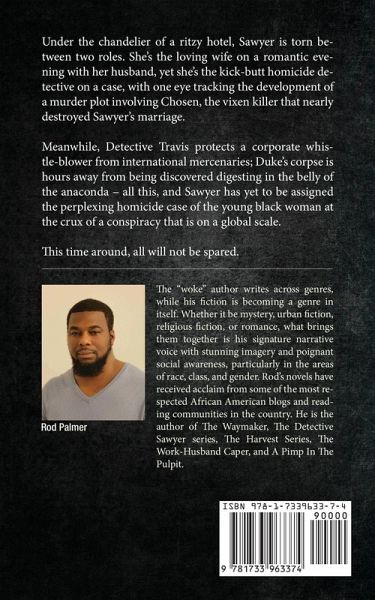 Man Eater: Karma Wears Versace II Under the chandelier of a ritzy hotel, Sawyer is torn between two roles. She's the loving wife on a romantic evening with her husband, yet she's the kick-butt homicide detective on a case, with one eye tracking the development of a murder plot involving Chosen, the vixen killer that nearly destroyed Sawyer's marriage. Meanwhile, Detective Travis protects a corporate whistle-blower from international mercenaries, and Duke's corpse is hours away from being discovered digesting in the belly of the anaconda - all this, and Sawyer has yet to be assigned the perplexing homicide case of a young black woman's murder that is at the crux of all the head scratching crimes plaguing Atlanta. This case, Sawyer takes personally because of how the media disrespects the young black woman in death, so Sawyer is not only out for justice, but to also to put some respect on this young, black female victim's name, when Sawyer learns that the injustice behind this young lady's death is much bigger than she thought. The ante is up higher than ever, yet Sawyer still has to be an excellent mother and a wife. Failure would have cataclysmic social consequences.Sawyer is not the only one in a fight for her life. This time around, all will not be spared.