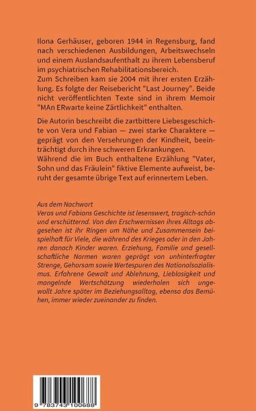 Die Autorin beschreibt die zartbittere Liebesgeschichte von Vera und Fabian - zwei starke Charaktere - geprägt von den Versehrungen der Kindheit, beeinträchtigt durch ihre schweren Erkrankungen. Während die im Buch enthaltene Erzählung "Vater, Sohn und das Fräulein" fiktive Elemente aufweist, beruht der gesamte übrige Text auf erinnertem Leben.Veras und Fabians Geschichte ist lesenswert, tragisch-schön und erschütternd. Von den Erschwernissen ihrer Leiden abgesehen ist ihr Ringen um Nähe und Zusammensein beispielhaft für Viele, die während des Krieges oder in den Jahren danach Kinder waren. Erziehung, Familie und gesellschaftliche Nor-men waren geprägt von unhinterfragter Strenge, Gehorsam sowie Wertespuren des Nationalsozialismus. Erfahrene Gewalt und Ablehnung, Lieblosigkeit und mangelnde Wertschätzung wiederholen sich ungewollt Jahre später in Beziehungen, ebenso das Bemühen, stets erneut zueinander zu finden.