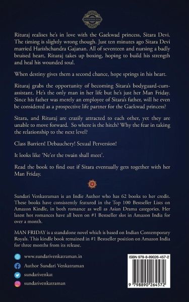 Rituraj realises he's in love with the Gaekwad princess, Sitara Devi. The timing is slightly wrong though. Just ten minutes ago Sitara Devi married Harishchandra Gajanan. All of seventeen and nursing a badly bruised heart, Rituraj takes up boxing, hoping to build his strength and heal his wounded soul. When destiny gives them a second chance, hope springs in his heart. Rituraj grabs the opportunity of becoming Sitara's bodyguard-cum-assistant. He's the only man in her life but he's just her Man Friday. Since his father was merely an employee of Sitara's father, will he even be considered as a prospective life partner for the Gaekwad princess? Sitara, and Rituraj are crazily attracted to each other, yet they are unable to move forward. So where is the hitch? Why the fear in taking the relationship to the next level? Class Barriers! Debauchery! Sexual Perversion! It looks like 'Ne'er the twain shall meet'. Read the book to find out if Sitara eventually gets together with her Man Friday.