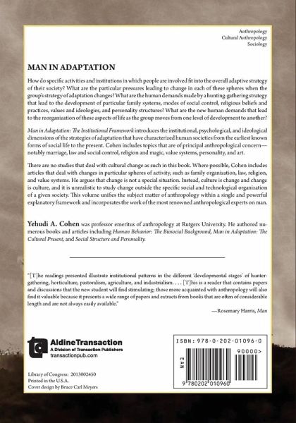 How do specific activities and institutions in which people are involved fit into the overall adaptive strategy of their society? What are the particular pressures leading to change in each of these spheres when the group's strategy of adaptation changes? What are the human demands made by a hunting-gathering strategy that lead to the development of particular family systems, modes of social control, religious beliefs and practices, values and ideologies, and personality structures? What are the new human demands that lead to the reorganization of these aspects of life as the group moves from one level of development to another? Man in Adaptation: The Institutional Framework introduces the institutional, psychological, and ideological dimensions of the strategies of adaptation that have characterized human societies from the earliest known forms of social life to the present. Cohen includes topics that are of principal anthropological concern-notably marriage, law and social control, religion and magic, value systems, personality, and art. There are no studies that deal with cultural change as such in this book. Where possible, Cohen includes articles that deal with changes in particular spheres of activity, such as family organization, law, religion, and value systems. He argues that change is not a special situation. Instead, culture is change and change is culture, and it is unrealistic to study change outside the specific social and technological organization of a given society. This volume unifies the subject matter of anthropology within a single and powerful explanatory framework and incorporates the work of the most renowned anthropological experts on man.