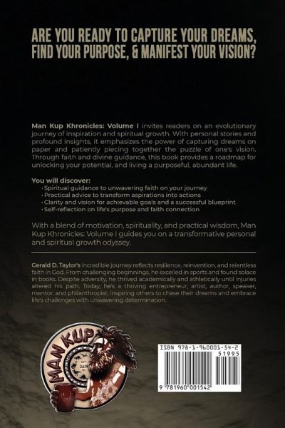 Man Kup Khronicles: Volume I invites readers on a transformative journey of inspiration and spiritual growth. With personal stories and profound insights, it emphasizes the power of capturing dreams on paper and patiently piecing together the puzzle of one's vision. Through faith and divine guidance, this book provides a roadmap for unlocking your potential, and living a purposeful, abundant life.