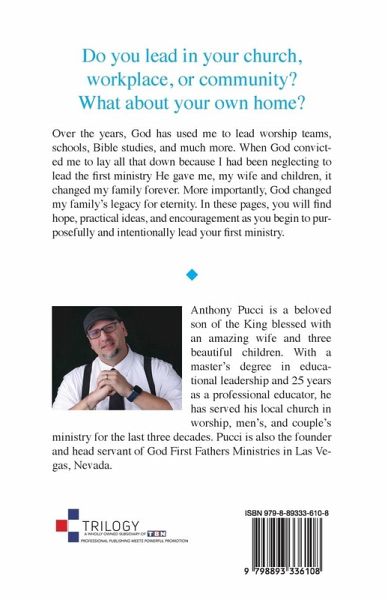 Do you lead in your church, workplace, or community? What about your own home? Over the years, God has used me to lead worship teams, schools, Bible studies, and much more. When God convict- ed me to lay all that down because I had been neglecting to lead the first ministry He gave me, my wife and children, it changed my family forever. More importantly, God changed my family's legacy for eternity. In these pages, you will find hope, practical ideas, and encouragement as you begin to purposefully and intentionally lead your first ministry.