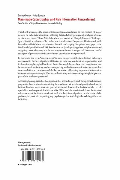 This book discusses the risks of information concealment in the context of major natural or industrial disasters - offering detailed descriptions and analyses of some 25 historical cases (Three Mile Island nuclear accident, Bhopal disaster, Challenger Space Shuttle explosion, Chernobyl nuclear disaster, Deepwater Horizon oil spill, Fukushima-Daiichi nuclear disaster, Enron's bankruptcy, Subprime mortgage crisis, Worldwide Spanish flu and SARS outbreaks, etc.) and applying these insights to selected on-going cases where such information concealment is suspected. Some successful examples of preventive anti-concealment practice are also presented.