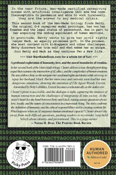 Set in the near future, man-made certified care-giving nurses with AI are the norm. Our unlikely heroine Betty, was the prototype of all the G-4s. The second book of the Man-Made trilogy, finds Betty adapting to a new life of having the same rights as any human. Still adjusting to emotions, she longs to give Mack Schwartz, her faithful civil rights lawyer and new husband "on paper", as priceless of a gift as he gave her of freedom. Endowed with new biological gifts, she must face a world of extra responsibilities. Still charmingly naïve at times, Betty risks her life as she encounters kidnappers and other adventures. In the process, we learn the truth of what really happened to give her emotions, and why she is so special. Mack's best friend FBI Special Agent Woody Everett becomes involved in their case. He remarks how Betty's unique features and abilities are akin to having a built-in crime lab. It is determined that she and Mack must go into hiding for protection, which will have a profound impact on their growing family and immediate future.