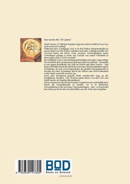 Man nannte ihn: "El Capitán"Mark Tanner, 37-jähriger Kapitän, liegt mit seinem Schiff in Vera Cruz und wartet auf Ladung.Während eines Landgangs wird er in den frühen Morgenstunden in einem Hotel von der Polizei verhaftet und unter Anklage gestellt: Der Vorwurf lautet auf Mord. Trotz enormer Anstrengungen seines Verteidigers gelingt es nicht, das Gericht von seiner Unschuld zu überzeugen und er wird verurteilt.Im Gefängnis wird er monatelang gedemütigt und sogar vergewaltigt. Die Zustände dort sind grausam und menschenverachtend - Essen gibt es nur gegen Bezahlung, die Zelle ist feucht und ohne Fenster - und dann widerfährt Mark das Glück in Form einer Wiederaufnahme seines Verfahrens, da sich zwei Drogendealer des größten Drogenkartells in Mexiko bei einer Festnahme durch die Polizei zum Mord bekennen wofür Mark verurteilt worden war.Nach dem Freispruch genießt Mark wundervolle Tage an der Pazifikküste Mexikos. Vier Wochen später kann er in den USA sein Schiff wieder als Kapitän übernehmen.Dieser Roman beschreibt die brutale Vorgehensweise und Infiltration durch die Drogenkartelle in Mexiko, sei es in Behörden, wirtschaftlichen oder privaten Unternehmungen - und - er beschreibt das Leben an Bord eines Frachtschiffes aus der Sicht eines Kapitäns.