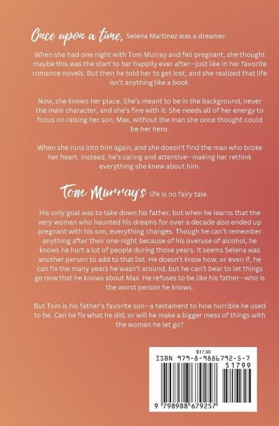 Once upon a time, Selena Martinez was a dreamer. When she had one night with Tom Murray and fell pregnant, she thought maybe this was the start to her happily ever after-just like in her favorite romance novels. But then he told her to get lost, and she realized that life isn't anything like a book. Now, she knows her place. She's meant to be in the background, never the main character, and she's fine with it. She needs all of her energy to focus on raising her son, Max, without the man she once thought could be her hero. When she runs into him again, and she doesn't find the man who broke her heart. Instead, he's caring and attentive-making her rethink everything she knew about him. Tom Murray's life is no fairy tale. His only goal was to take down his father, but when he learns that the very woman who haunted his dreams for over a decade also ended up pregnant with his son, everything changes. Though he can't remember anything after their one-night because of his overuse of alcohol, he knows he hurt a lot of people during those years. It seems Selena was another person to add to that list. He doesn't know how, or even if, he can fix the many years he wasn't around, but he can't bear to let things go now that he knows about Max. He refuses to be like his father-who is the worst person he knows. But Tom is his father's favorite son-a testament to how horrible he used to be. Can he fix what he did, or will he make a bigger mess of things with the woman he let go?