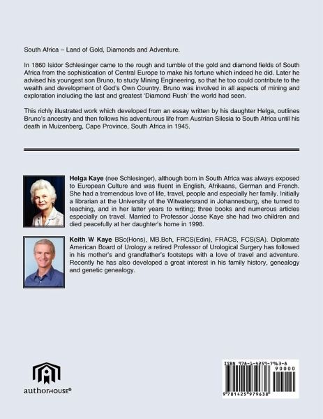 South Africa - Land of Gold, Diamonds and Adventure. In 1860 Isidor Schlesinger came to the rough and tumble of the gold and diamond fields of South Africa from the sophistication of Central Europe to make his fortune which indeed he did. Later he advised his youngest son Bruno, to study Mining Engineering, so that he too could contribute to the wealth and development of God's Own Country. Bruno was involved in all aspects of mining and exploration including the last and greatest 'Diamond Rush' the world had seen. This richly illustrated work which developed from an essay written by his daughter Helga, outlines Bruno's ancestry and then follows his adventurous life from Austrian Silesia to South Africa until his death in Muizenberg, Cape Province, South Africa in 1945.