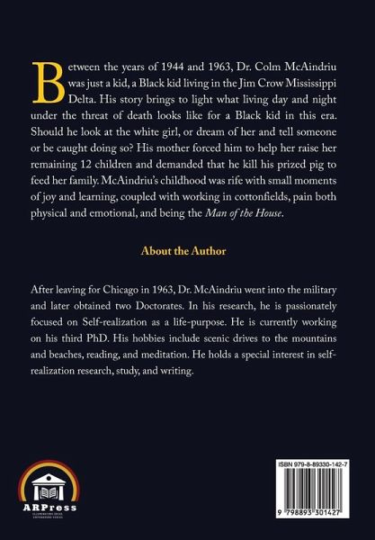 Between the years of 1944 and 1963, Dr. Colm McAindriu was just a kid, a Black kid living in the Jim Crow Mississippi Delta. His story brings to light what living day and night under the threat of death looks like for a Black kid in this era. Should he look at the white girl, or dream of her and tell someone or be caught doing so? His mother forced him to help her raise her remaining 12 children and demanded that he kill his prized pig to feed her family. McAindriu's childhood was rife with small moments of joy and learning, coupled with working in cottonfields, pain both physical and emotional, and being the Man of the House.