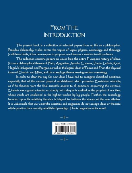 The present book is a collection of papers from my life as a philosopher. Besides philosophy, it also covers the topics of logics, physics, cosmology, and theology. In all these fields, it has been my aim to propose new ideas as a solution to old problems. The collection contains papers on issues from the entire European history of ideas, treating philosophical themes of Plato, Augustine, Anselm, Dante, Cusanus, Leibniz, Kant, Hegel, Kierkegaard, and Borges, together with the logical ideas of Peirce and Prior, the physical ideas of Einstein and Milne, and the crazy hypotheses marring modern cosmology. In order to clear the way for new ideas I have had to chastice cherised positions, espcially that of the current physical establishment which promotes Einsteinian relativity as if his theories were the final scientific answer to all questions concerning the universe. Einstein was a great scientist, no doubt, but today he is exalted as the prophet of our time, whose words are swallowed as the highest wisdom by lay people. Further, the cosmology founded upon his relativity theories are feigned to buttress the stance of the new atheism. It is unbearable that our scientific societies and magazines do not accept ideas which question the currently established scientific paradigm. This is dogmatism at its worst!