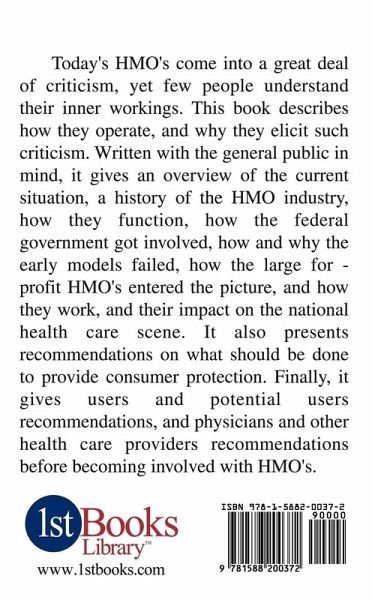 Today's HMOs come into a great deal of criticism, yet few people understand their inner workings. This book describes how they operate and why they elicit such criticism. Written with the general public in mind, it gives an overview of the current situation, a history of the HMO industry and how they function, how the federal government got involved, how and why the early models failed, how the large for-profit HMOs entered the picture and how they work, and their impact on the national health care scene. It also presents recommendations on what should be done to provide consumer protection. Finally, it gives users and potential users recommendations, and physicians and other health care provider's recommendations, before becoming involved with HMOs.