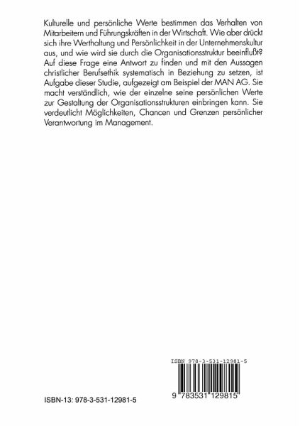 Kulturelle und persönliche Werte bestimmen das Verhalten von Mitarbeitern und Führungskräften in der Wirtschaft. Wie aber drückt sich ihre Werthaltung und Persönlichkeit in der Untenehmenskultur aus, und wie wird sie durch die Organisationskultur beeinflußt? Auf diese Frage eine Antwort zu finden und mit den Aussagen christlicher Berufsethik systematisch in Beziehung zu setzen, ist Aufgabe dieser Studie, aufgezeigt am Beispiel der MAN AG. Sie macht verständlich, wie der einzelne seine persönlichen Werte zur Gestaltung der Organisationsstrukturen einbringen kann. Sie verdeutlicht Möglichkeiten, Chancen und Grenzen persönlicher Verantwortung im Management.
