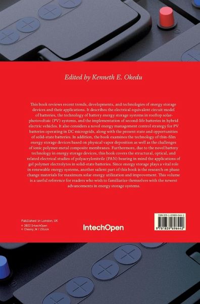 This book reviews recent trends, developments, and technologies of energy storage devices and their applications. It describes the electrical equivalent circuit model of batteries, the technology of battery energy storage systems in rooftop solar-photovoltaic (PV) systems, and the implementation of second-life batteries in hybrid electric vehicles. It also considers a novel energy management control strategy for PV batteries operating in DC microgrids, along with the present state and opportunities of solid-state batteries. In addition, the book examines the technology of thin-film energy storage devices based on physical vapor deposition as well as the challenges of ionic polymer-metal composite membranes. Furthermore, due to the novel battery technology in energy storage devices, this book covers the structural, optical, and related electrical studies of polyacrylonitrile (PAN) bearing in mind the applications of gel polymer electrolytes in solid-state batteries. Since energy storage plays a vital role in renewable energy systems, another salient part of this book is the research on phase change materials for maximum solar energy utilization and improvement. This volume is a useful reference for readers who wish to familiarize themselves with the newest advancements in energy storage systems.