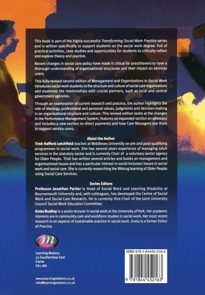 This fully revised and updated second edition looks at the study of social work management and organisations, focusing on relationships with crucial partners such as central government agencies, local partners and other social care organisations. Through an examination of current research and practice, the author explores the relationships between ideology, professional and personal values and decision making in organisational culture. Included in the text are case studies, activities and further reading lists to aid learning.