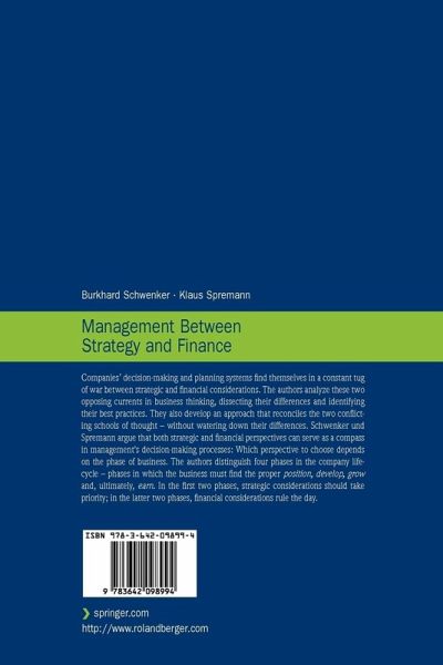 Companies' decision-making and planning systems find themselves in a constant tug of war between strategic and financial considerations. The authors analyze these two opposing currents in business thinking, dissecting their differences and identifying their best practices. They also develop an approach that reconciles the two conflicting schools of thought - without watering down their differences. Schwenker und Spremann argue that both strategic and financial perspectives can serve as a compass in management's decision-making processes: Which perspective to choose depends on the phase of business. The authors distinguish four phases in the company lifecycle - phases in which the business must find the proper position, develop, grow and, ultimately, earn. In the first two phases, strategic considerations should take priority; in the latter two phases, financial considerations rule the day.