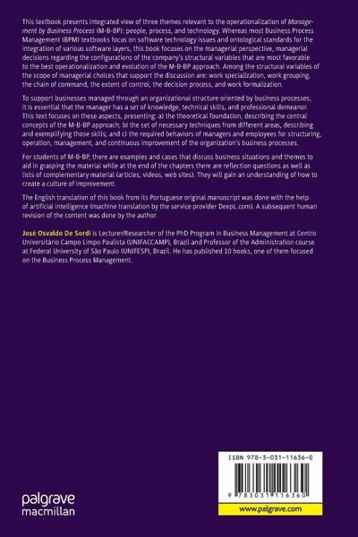 This textbook presents an integrated view of three themes relevant to the operationalization of Management by Business Process (M-B-BP): people, process, and technology. Whereas most Business Process Management (BPM) textbooks focus on software technology issues and ontological standards for the integration of various software layers, this book focuses on the managerial perspective, managerial decisions regarding the configurations of the company's structural variables that are most favorable to the best operationalization and evolution of the M-B-BP approach. Among the structural variables of the scope of managerial choices that support the discussion are: work specialization, work grouping, the chain of command, the extent of control, the decision process, and work formalization.