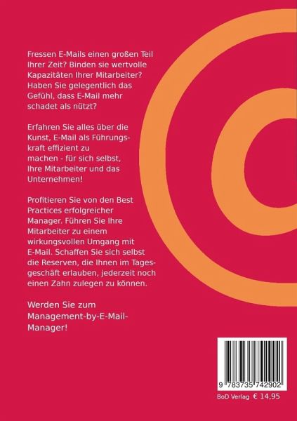 Fressen E-Mails einen großen Teil Ihrer Zeit? Binden E-Mails wertvolle Kapazitäten Ihrer Mitarbeiter? Haben Sie gelegentlich das Gefühl, dass E-Mail mehr schadet als nützt?Erfahren Sie alles über die Kunst, E-Mail effizienter zu machen - für sich selbst, Ihre Mitarbeiter und das Unternehmen!Profitieren Sie von den Best Practices erfolgreicher Manager. Führen Sie Ihre Mitarbeiter zu einem wirkungsvollen Umgang mit E-Mail. Schaffen Sie sich selbst die Reserven, die Ihnen im Tagesgeschäft erlauben, jederzeit noch einen Zahn zulegen zu können.Nutzen Sie die Management-by-E-Mail-Prinzipien wie viele erfolgreiche Manager vor Ihnen.