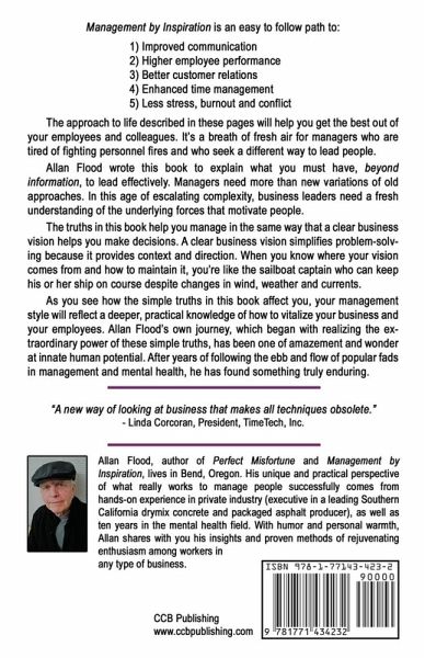 Management by Inspiration is an easy to follow path to: 1) Improved communication, 2) Higher employee performance, 3) Better customer relations, 4) Enhanced time management, and 5) Less stress, burnout and conflict. The approach to life described in these pages will help you get the best out of your employees and colleagues. It's a breath of fresh air for managers who are tired of fighting personnel fires and who seek a different way to lead people. Allan Flood wrote this book to explain what you must have, beyond information, to lead effectively. Managers need more than new variations of old approaches. In this age of escalating complexity, business leaders need a fresh understanding of the underlying forces that motivate people. The truths in this book help you manage in the same way that a clear business vision helps you make decisions. A clear business vision simplifies problem-solving because it provides context and direction. When you know where your vision comes from and how to maintain it, you're like the sailboat captain who can keep his or her ship on course despite changes in wind, weather and currents. As you see how the simple truths in this book affect you, your management style will reflect a deeper, practical knowledge of how to vitalize your business and your employees. Allan Flood's own journey, which began with realizing the extraordinary power of these simple truths, has been one of amazement and wonder at innate human potential. After years of following the ebb and flow of popular fads in management and mental health, he has found something truly enduring. About the Author: Allan Flood, author of Perfect Misfortune and Management by Inspiration, lives in Bend, Oregon. His unique and practical perspective of what really works to manage people successfully comes from hands-on experience in private industry (executive in a leading Southern California drymix concrete and packaged asphalt producer), as well as ten years in the mental health field. With humor and personal warmth, Allan shares with you his insights and proven methods of rejuvenating enthusiasm among workers in any type of business.