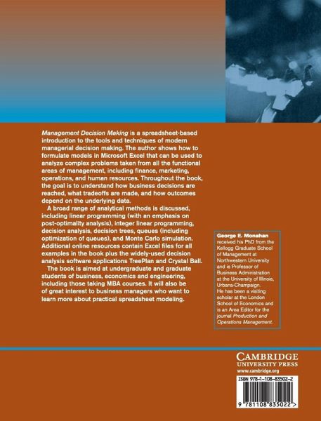 Management Decision Making is a spreadsheet-based introduction to the tools and techniques of modern managerial decision making. The author shows how to formulate models in Microsoft Excel that can be used to analyse complex problems taken from all the functional areas of management, including finance, marketing, operations, and human resources.