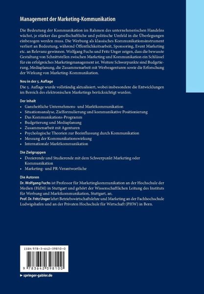 Die Bedeutung der Kommunikation im Rahmen des unternehmerischen Handelns wächst, je stärker das gesellschaftliche und politische Umfeld in die Überlegungen einbezogen werden muss. Die Werbung als klassisches Kommunikationsinstrument verliert an Bedeutung, während Öffentlichkeitsarbeit, Sponsoring, Event Marketing etc. an Relevanz gewinnen. Wolfgang Fuchs und Fritz Unger zeigen, dass die bewusste Gestaltung von Schnittstellen zwischen Marketing und Kommunikation ein Schlüssel für ein erfolgreiches Marketingmanagement ist. Weitere Schwerpunkte sind Budgetierung, Mediaplanung, die Zusammenarbeit mit Werbeagenturen sowie die Erforschung der Wirkung von Marketing-Kommunikation.