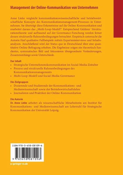Anne Linke vergleicht kommunikationswissenschaftliche und betriebswirtschaftliche Konzepte des Kommunikationsmanagement-Prozesses in Unternehmen. Sie überträgt diese Erkenntnisse auf die Online-Kommunikation und erarbeitet daraus das "Multi-Loop-Modell". Entsprechend Giddens` Strukturationstheorie und aufbauend auf der Governance-Forschung werden ferner dessen strukturelle Rahmenbedingungen betrachtet. Empirisch untersucht die Autorin fünf qualitative Fallbeispiele mittels Experteninterviews und Inhaltsanalysen. Anschließend wird der Status quo in Deutschland über eine quantitative Online-Befragung erhoben. Die Ergebnisse zeigen ein theoretisch fundiertes, systematisches Bild und fokussieren übergeordnete Veränderungen, Zusammenhänge sowie Unterschiede.