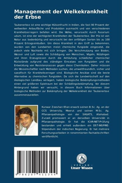 Taubenerbse ist eine wichtige Hülsenfrucht in Indien, die fast 90 Prozent der weltweiten Anbaufläche und Produktion ausmacht und von verschiedenen Krankheitserregern befallen wird. Die Welke, verursacht durch Fusarium udum, ist eine der wichtigsten Krankheiten der Taubenerbse. Der Pilz ist von Natur aus bodenbürtig und verursacht bei den anfälligen Sorten bis zu 100 Prozent Ertragseinbußen. Um diese Krankheit in den Griff zu bekommen, wurden von den Landwirten meist chemische Fungizide eingesetzt, die jedoch viele Nachteile mit sich bringen. Die Verschmutzung von Boden, Wasser und Luft sowie die Schädigung von Menschen, Vögeln, Nützlingen und ihren Erzeugnissen durch die Anhäufung schädlicher chemischer Rückstände aufgrund des ständigen Einsatzes von Fungiziden und die Entwicklung von Resistenzrassen gegen diese Chemikalien. Daher müssen die Wissenschaftler nach Methoden suchen, die umweltfreundlich, sicher und spezifisch für Krankheitserreger sind. Biologische Ansätze sind die beste Alternative zu chemischen Fungiziden. Da sich die Landwirtschaft auf den ökologischen Landbau verlagert, haben biologische Bekämpfungsmethoden einen viel größeren Spielraum bei der Schädlingsbekämpfung. Vor diesem Hintergrund haben wir versucht, in diesem Buch Informationen über biologische Methoden zur Bekämpfung der Welkekrankheit der Taubenerbse zusammenzustellen.