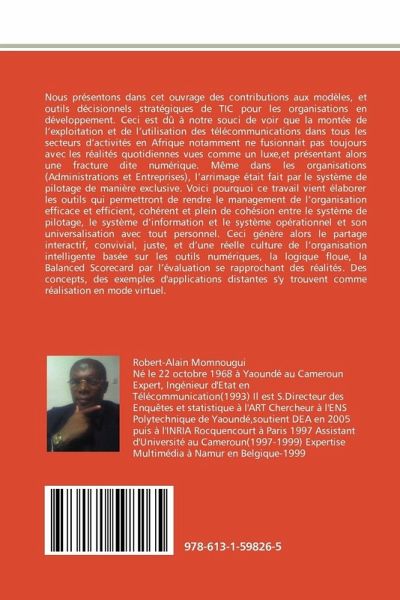Nous présentons dans cet ouvrage des contributions aux modèles, et outils décisionnels stratégiques de TIC pour les organisations en développement. Ceci est dû à notre souci de voir que la montée de l exploitation et de l utilisation des télécommunications dans tous les secteurs d activités en Afrique notamment ne fusionnait pas toujours avec les réalités quotidiennes vues comme un luxe,et présentant alors une fracture dite numérique. Même dans les organisations (Administrations et Entreprises), l arrimage était fait par le système de pilotage de manière exclusive. Voici pourquoi ce travail vient élaborer les outils qui permettront de rendre le management de l organisation efficace et efficient, cohérent et plein de cohésion entre le système de pilotage, le système d information et le système opérationnel et son universalisation avec tout personnel. Ceci génère alors le partage interactif, convivial, juste, et d une réelle culture de l organisation intelligente basée sur les outils numériques, la logique floue, la Balanced Scorecard par l évaluation se rapprochant des réalités. Des concepts, des exemples d'applications distantes s'y trouvent comme réalisation en mode virtuel.