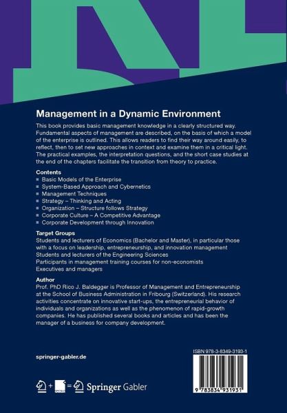 This book provides basic management knowledge in a clearly structured way. Fundamental aspects of management are described, on the basis of which a model of the enterprise is outlined. This allows readers to find their way around easily, to reflect, then to set new approaches in context and examine them in a critical light. The practical examples, the interpretation questions, and the short case studies at the end of the chapters facilitate the transition from theory to practice. This book provides basic management knowledge in a clearly structured way. Fundamental aspects of management are described, on the basis of which a model of the enterprise is outlined. This allows readers to find their way around easily, to reflect, then to set new approaches in context and examine them in a critical light. The practical examples, the interpretation questions, and the short case studies at the end of the chapters facilitate the transition from theory to practice.