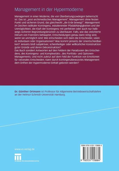 Management in einer Moderne, die von Überbietungszwängen beherrscht wird: Das ist "post-archimedisches Management", Management ohne festen Punkt und sicheren Grund, das gleichwohl "die Erde bewegt"; Management im Zeichen radikaler Kontingenz, eskalierender Pfadabhängigkeiten und der Unmöglichkeit, die Kluft der Kontingenz mit perfekten oder auch nur halbwegs sicheren Begründungsbrücken zu überbauen. Falls, wie das vielzitierte Diktum von Foersters behauptet, Entscheidungen genau dann nötig sind, wenn sie unmöglich sind: Wie entscheiden sich dann die Entscheider, seien es Individuen oder Organisationen? Was kommt jenseits der Unentscheidbarkeit? Jenseits bloß subjektiver, scheinheiliger oder willkürlicher Konstruktion guter Gründe und deren Dekonstruktion? Das Buch sondiert Antworten auf den Feldern der Paradoxien des Entscheidens, des Kontingenz- und Komplexitäts-, des Portfolio- und Optionen-Managements. Und nicht zuletzt auf dem Feld der Funktion von Emotionen für rationales Entscheiden. - Kann durch kontingenzbewusstes Management dem Driften der Hypermoderne Einhalt geboten werden?