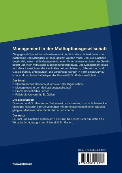 Die gegenwärtige Wirtschaftskrise macht deutlich, dass die herkömmliche Ausbildung von Managern in Frage gestellt werden muss. Joël Luc Cachelin begründet, warum sich Management neben Unternehmen auch mit der Gesellschaft und ihren Individuen auseinandersetzen muss. Das Management muss sich darauf ausrichten, die Identitätsarbeit von Mensch, Unternehmen und Gesellschaft zu unterstützen. Die Vorschläge werden in Form eines Curriculums und durch das Fallbeispiel der Universität St. Gallen verdichtet.