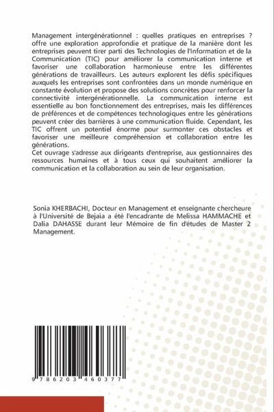 Management intergénérationnel : quelles pratiques en entreprises ? offre une exploration approfondie et pratique de la manière dont les entreprises peuvent tirer parti des Technologies de l'Information et de la Communication (TIC) pour améliorer la communication interne et favoriser une collaboration harmonieuse entre les différentes générations de travailleurs. Les auteurs explorent les défis spécifiques auxquels les entreprises sont confrontées dans un monde numérique en constante évolution et propose des solutions concrètes pour renforcer la connectivité intergénérationnelle. La communication interne est essentielle au bon fonctionnement des entreprises, mais les différences de préférences et de compétences technologiques entre les générations peuvent créer des barrières à une communication fluide. Cependant, les TIC offrent un potentiel énorme pour surmonter ces obstacles et favoriser une meilleure compréhension et collaboration entre les générations. Cet ouvrage s'adresse aux dirigeants d'entreprise, aux gestionnaires des ressources humaines et à tous ceux qui souhaitent améliorer la communication et la collaboration au sein de leur organisation.