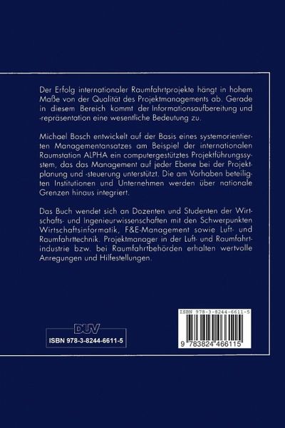 Der Erfolg internationaler Raumfahrtprojekte hängt in hohem Maße von der Qualität des Projektmanagements ab. Gerade in diesem Bereich kommt der Informationsaufbereitung und -repräsentation eine wesentliche Bedeutung zu. Michael Bosch entwickelt auf der Basis eines systemorientierten Managementansatzes am Beispiel der internationalen Raumstation ALPHA ein computergestütztes Projektführungssystem, das das Management auf jeder Ebene bei der Projektplanung und -steuerung unterstützt. Die am Vorhaben beteiligten Institutionen und Unternehmen werden über nationale Grenzen hinaus integriert.